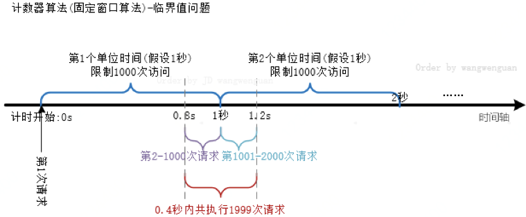 固定窗口计数器算法相对简单,但会存在临界问题(何为临界问题?临界问题即为用户流量并不会像我们所期望的匀速请求,而是可能在某个时间点集中爆发)。如下图所示:在第一个单位时间内的前800ms只有一次请求,后200ms(800ms-1s范围内)内承载999次请求,而第二个单位时间内前200ms承载1001-2000次共1000个请求。这样系统在400ms(800ms到1200ms时间范围内)内共承载了1999次用户请求,此访问量已经远远超出系统所能承载的1000次请求(系统最大QPS),从而给系统带来灾难性后果。