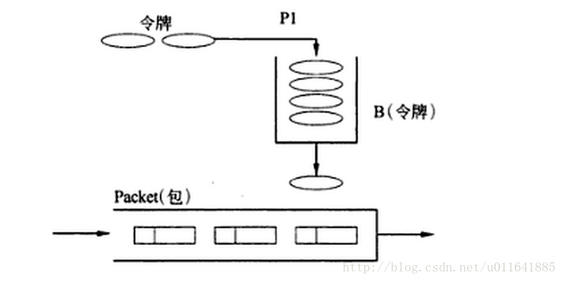 每个到来的令牌从数据队列中收集一个数据包,然后从桶中被删除。这个算法关联到两个流上————令牌流和数据流。于是由3种情景: