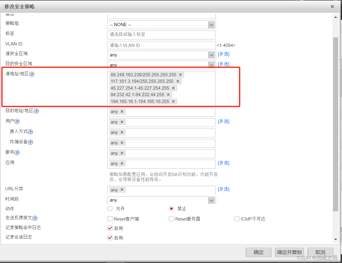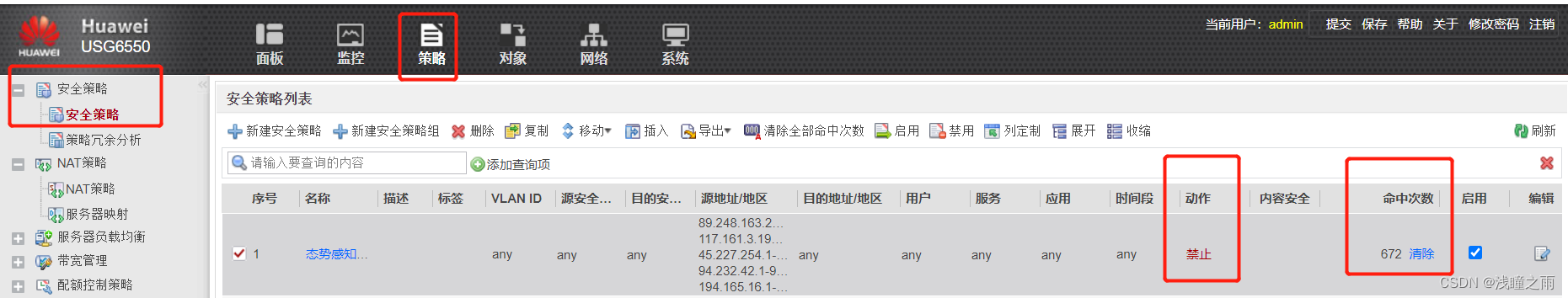 以上就是超级衬衫最近收集整理的关于华为防火墙设置安全策略,封禁高危异常ip的全部内容,更多相关华为防火墙设置安全策略内容请搜索靠谱客的其他文章。