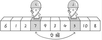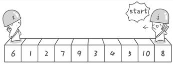 霍尔排序思路:采用数列第一个数作为基数,然后在数列的收尾两端分别设置两个“哨兵”,两个哨兵分别向中间探测比基数大、小的数,然后进行交换。如下图展示: