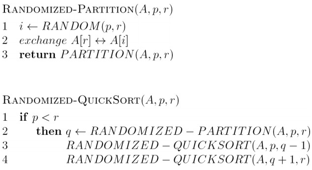 因为快排中Partition所产生的划分中可能会有”差的“,而划分的关键在于主元A[r]的选择。我们可以采用一种不同的、称为随机取样的随机化技术,把主元A[r]和A[p..r]中随机选出一个元素交换,这样相当于,我们的主元不在是固定是最后一个A[r],而是随机从p,...,r这一范围随机取样。这样可以使得期望平均情况下,Partition的划分能够比较对称。