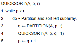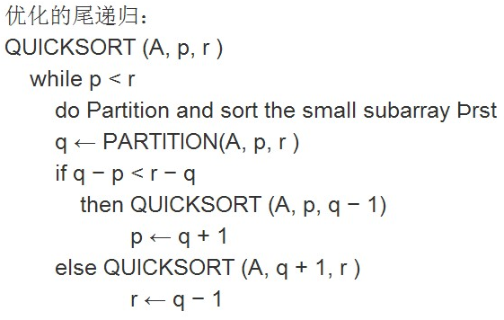 QUICKSORT算法包含两个对其自身的递归调用,即调用PARTITION后,左边的子数组和右边的子数组分别被递归排序。QUICKSORT中的第二次递归调用并不是必须的,可以用迭代控制结构来代替它,这种技术叫做“尾递归”,大多数的编译器也使用了这项技术。
