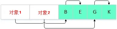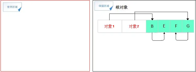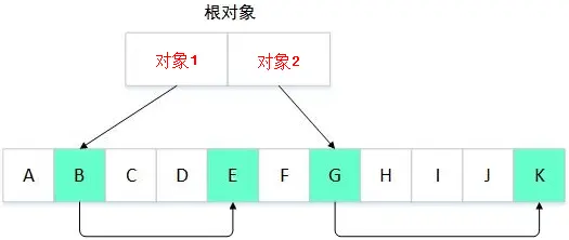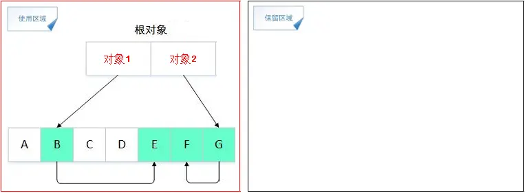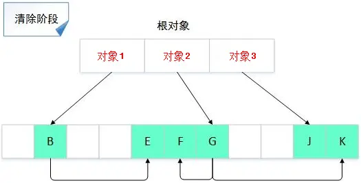 上面两张图是标记/清除算法的示意图,在标记阶段,从对象1可以访问到B对象,从B对象又可以访问到E对象,因此从GC 对象1到B、E都是可达的,同理,对象F、G、J、K都是可达对象;到了清除阶段,所有不可达对象都会被回收。