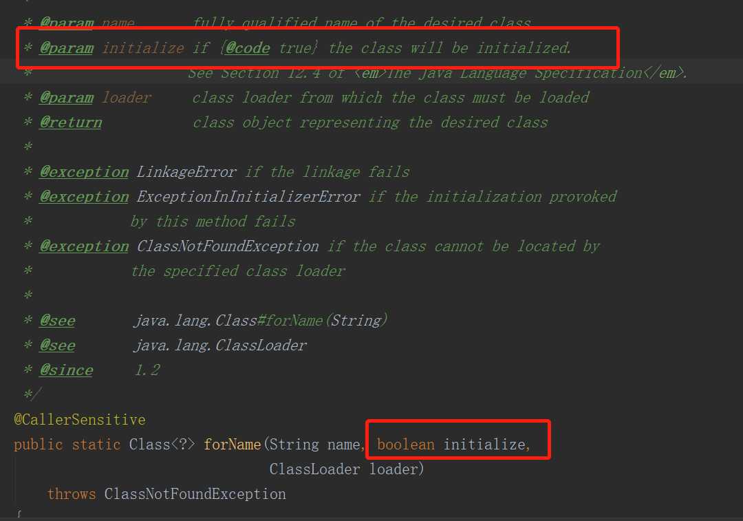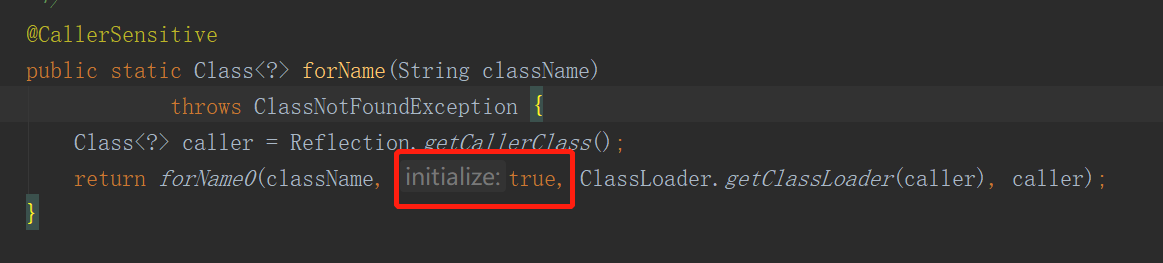 这里面,forName0的第二个参数为true,表示对加载的类进行初始化化。其实还可以调用Class<?> forName(String name, boolean initialize, ClassLoader loader)方法实现一样的功能,它的源码如下: