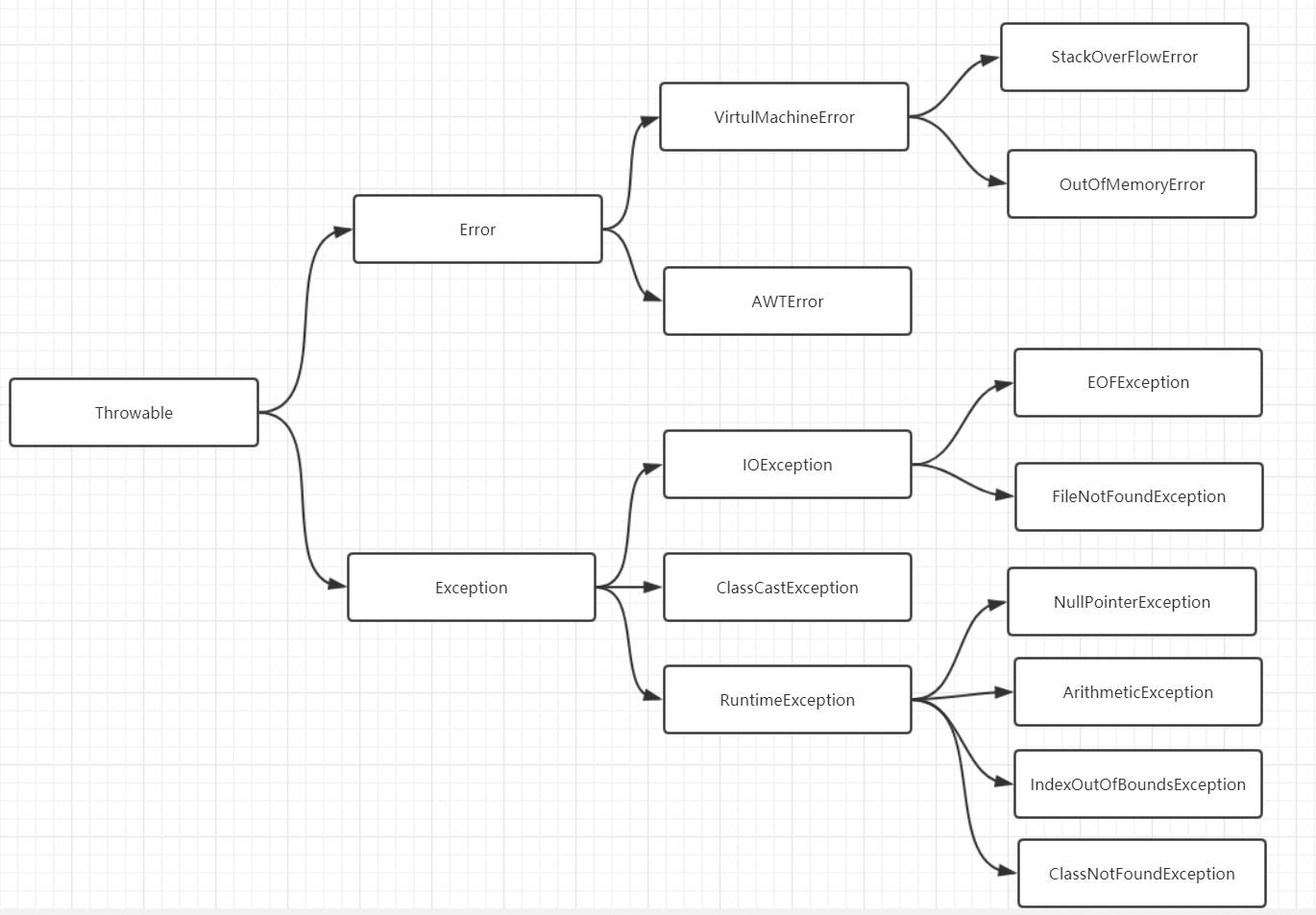 它可以分为RuntimeException(运行时异常)和CheckedException(可检查的异常)。