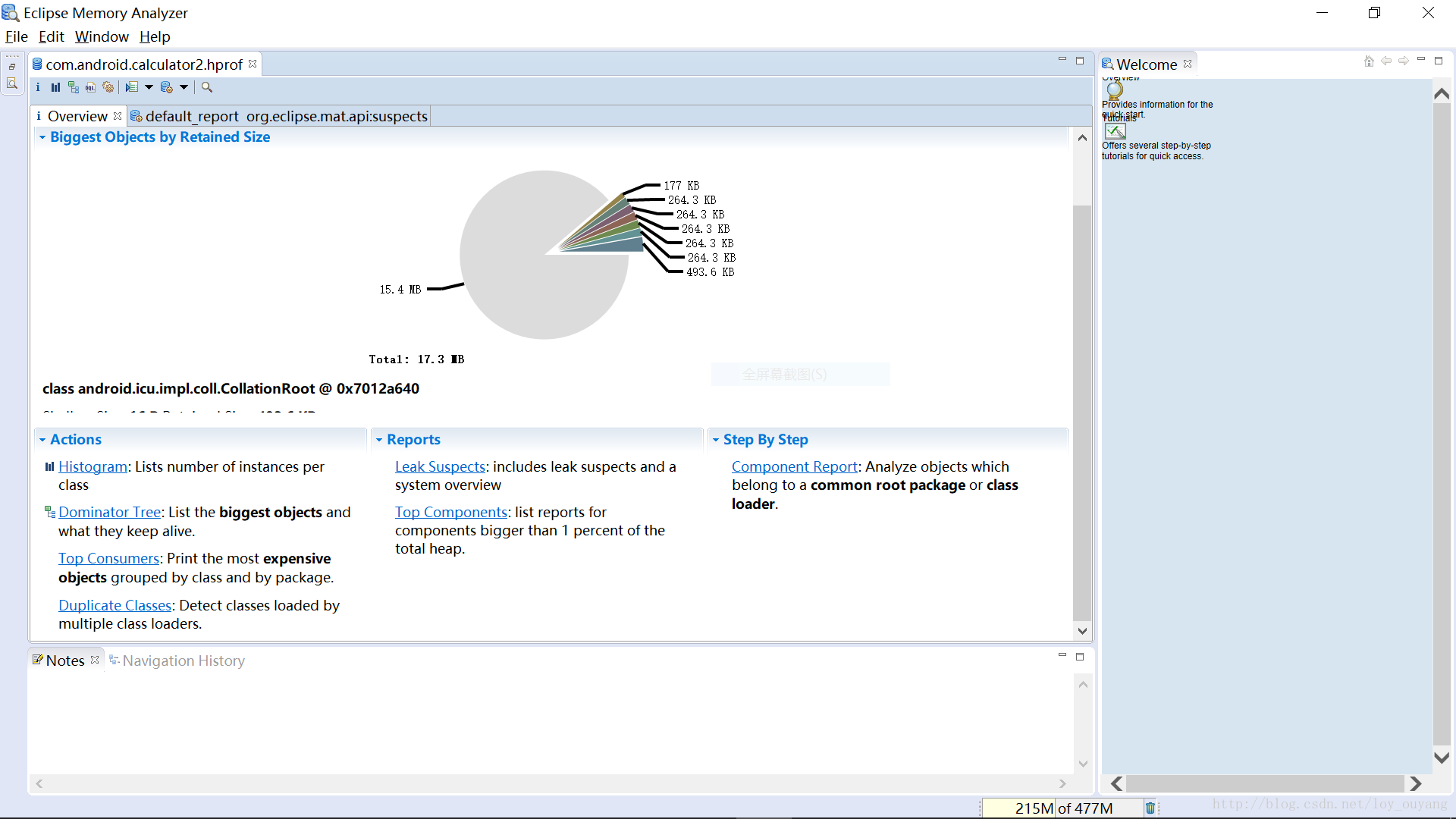 MAT中提供了非常多的功能,这里我们只要学习几个最常用的就可以了。上图最中央的那个饼状图展示了最大的几个对象所占内存的比例,这张图中提供的内容并不多,我们可以忽略它。在这个饼状图下就有几个非常有用的工具了,我们来学习一下。