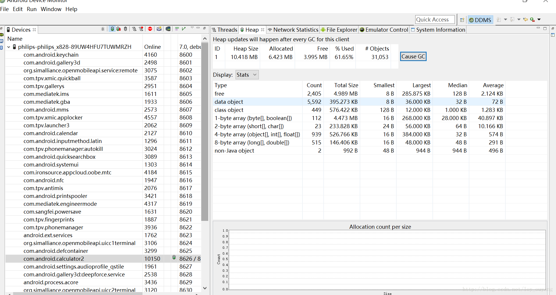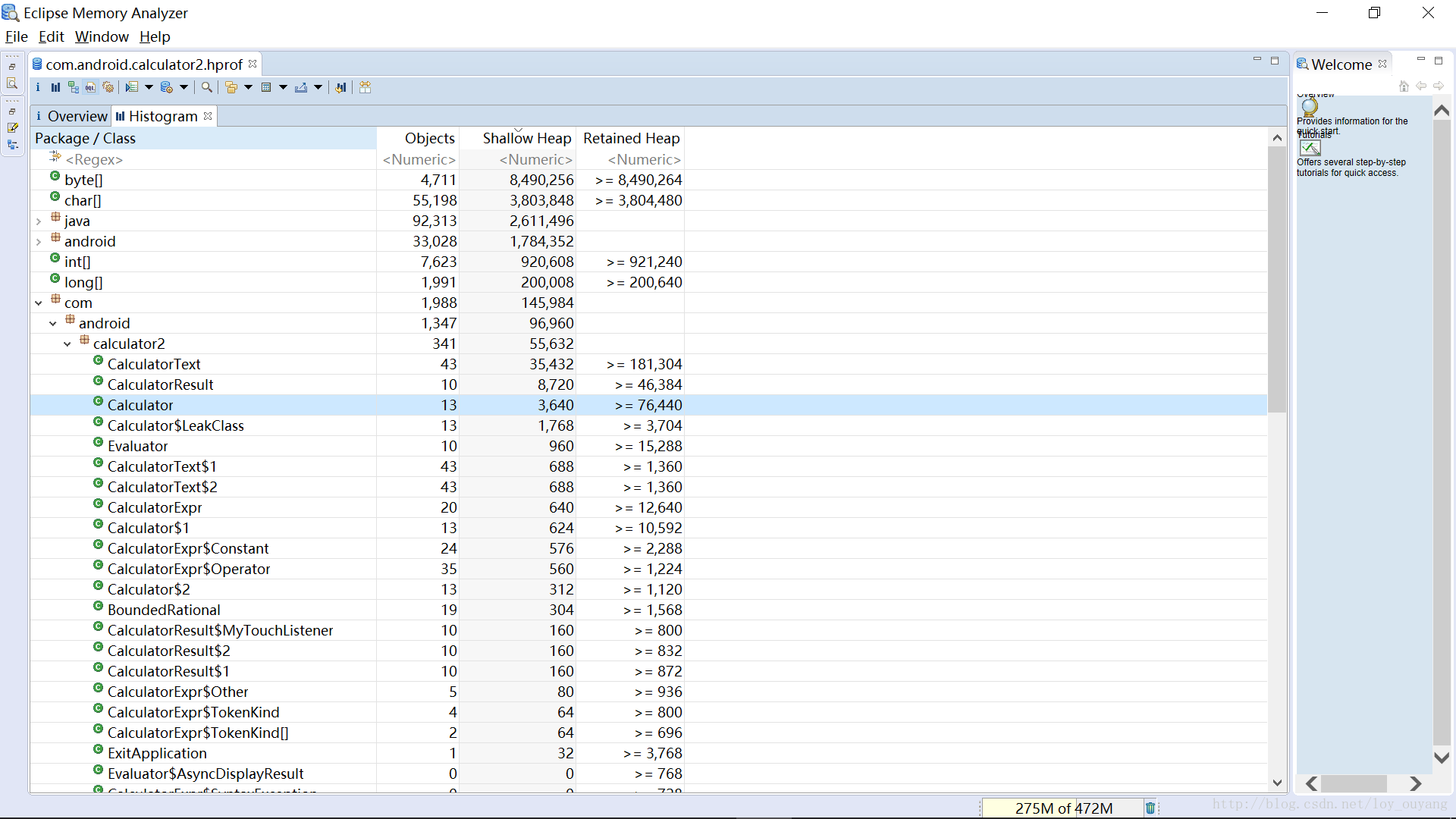 图中,我们可以看到类实例对象的个数和大小。那么我们现在就通过Histogram又怎么去分析内存泄漏的原因。我们怀疑主Activity存在泄露,那么直接搜索Calculator,搜索结果如下图: