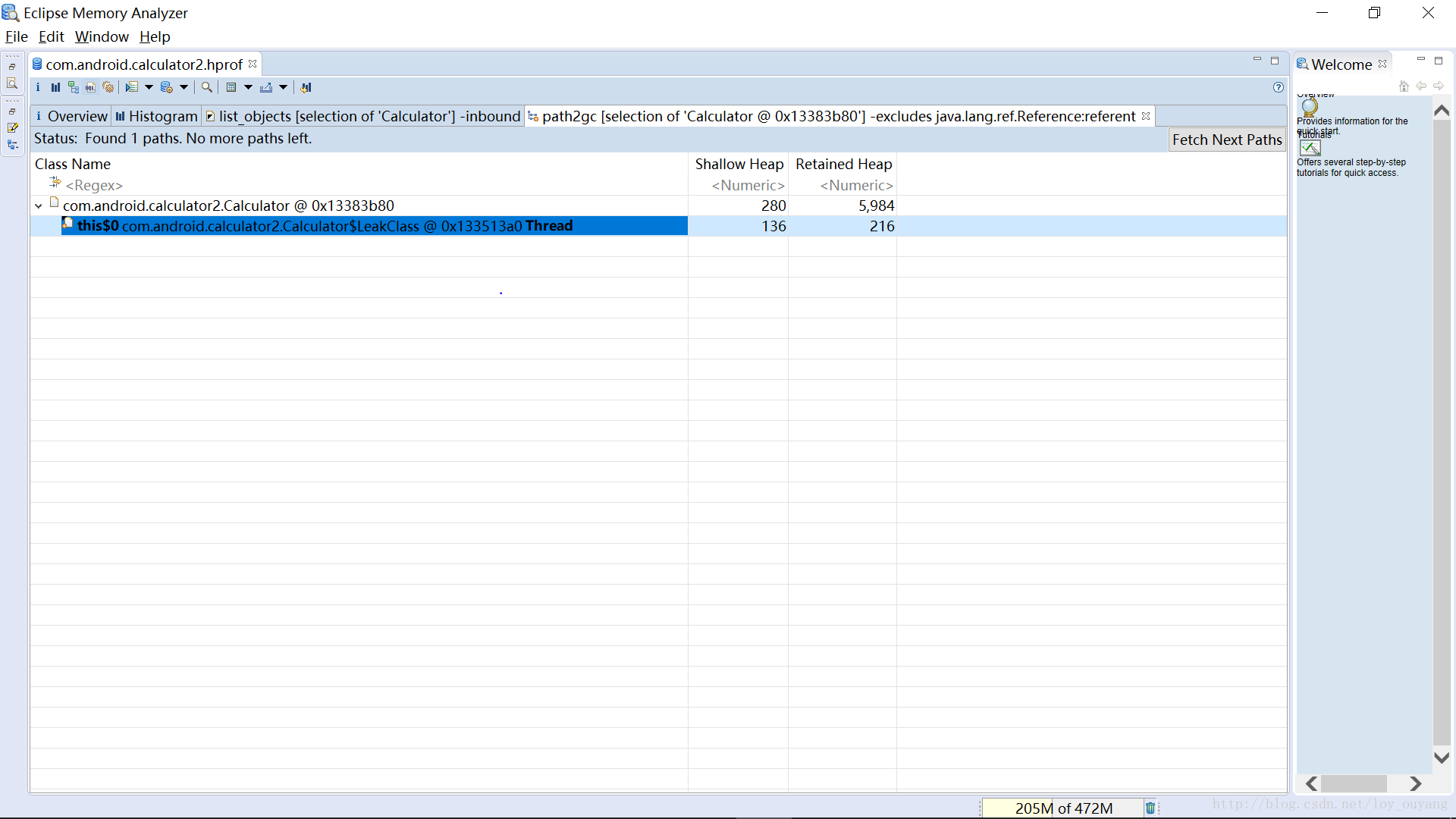 这是在没有操作apk的情况下得到的.hprof文件,Calculator(Activity)实例只有一个。
