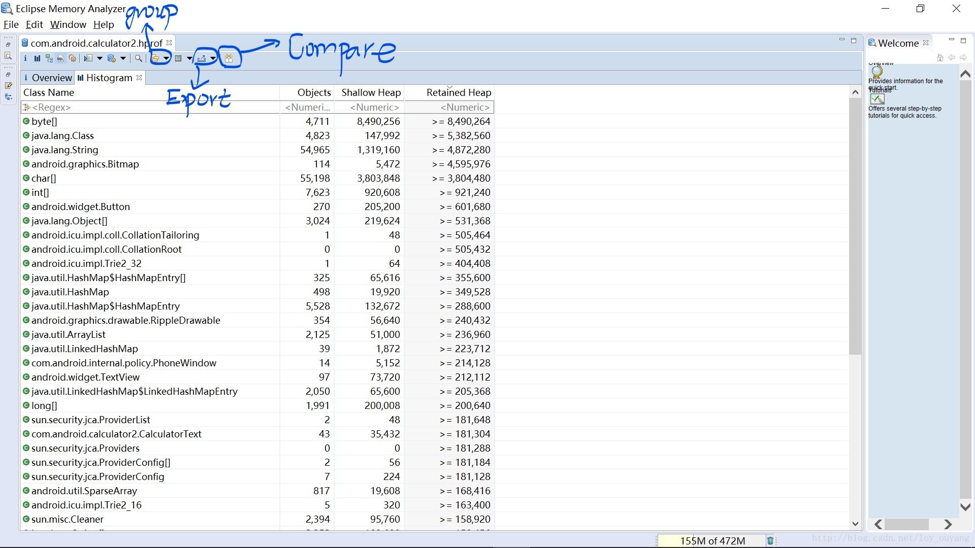 我再介绍几个MAT比较有用的功能菜单,这里我介绍三个,Group菜单,Export菜单,Compare菜单,其他功能可自行研究,菜单位置如下图: