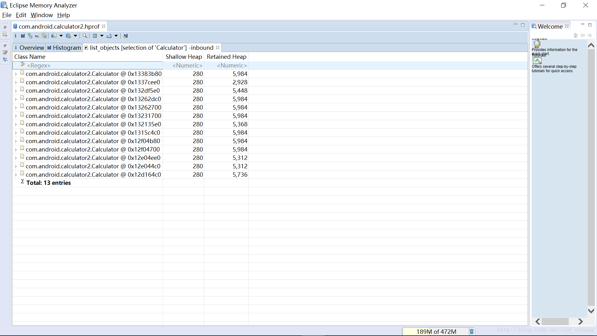 发现Calculator数目是13个,这太不正常,通常情况下一个Activity只有一个实例才对。接下来对Calculator右键,点开List objects -> with incomingreferences,查看一下到底是哪些外部对象持有了Calculator实例,结果如下图: