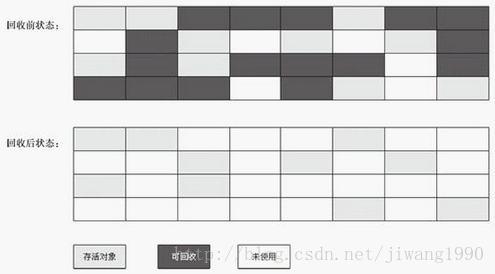 下面我们来看一下复制算法(Copy)和标记-整理(Mark-Compact)算法的具体实现,其实这两个算法都是从标记-清除(Mark-Sweep)算法改进而来的,标记清除算法会遇到两个问题:第一个问题是效率问题,当对象存活率很低时,其实把存活对象找出来并整理到一个区域,效率会更高,这就是复制算法;第二个问题是当存活率比较高时,会出现内存碎片问题,所以出现了标记-整理算法。Java堆采用了新生代为复制算法,老年代为标记-整理或标记-清除算法的分代收集机制。