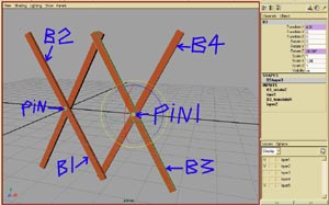 4 .选择 b1 、 b2 和 pin ,按 ctrl+d 一起复制这三个物体,并向右移动一些距离。多与少不要紧,等会输入的表达式会帮助修正的。 maya 会自动取名的,如不对请改为如图所示,否则会与下面的表达式不符。