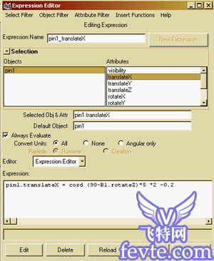 7 .再来复制多一组,分别取名 b5 、 b6 、 pin2 。选择 pin2, 在表达式编辑器中键入 pin2.translatex =cosd (90-b1.rotatez)*5 4 -0.2 这条语句用来控制 pin2 随着 b1 的 z 轴旋转而沿着 x 轴平移。这次是乘以 4 ,每复制多一组,就要在前一组数值的基础上加 "2", 在第三组时就是 "6" 。道理不用说了吧。 控制 b5 的移动和旋转: b5.translatex= pin2.translatex ;b5.rotatez = b1.rotatez b6 的移动和旋转: b6.translatex = pin2.translatex; b6.rotatez = b1.rotatez * -1