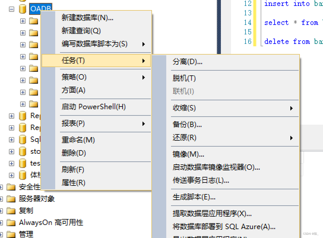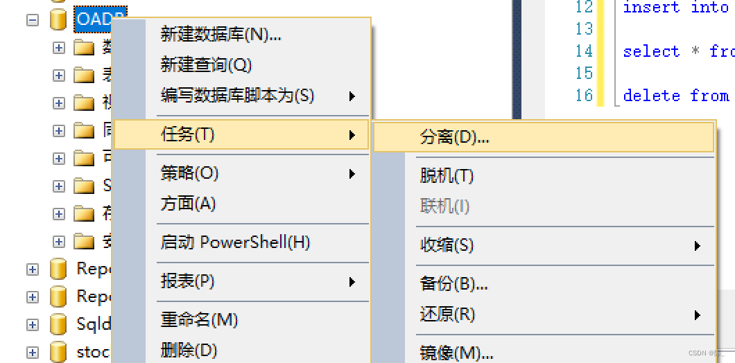 步骤1:选择需要转移的数据库->右击数据库->任务->脱机
