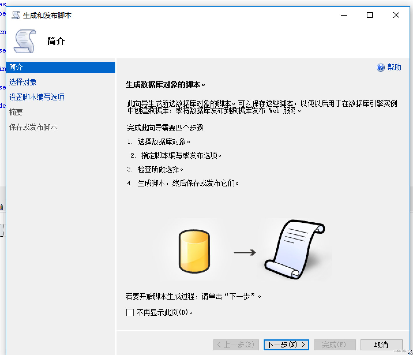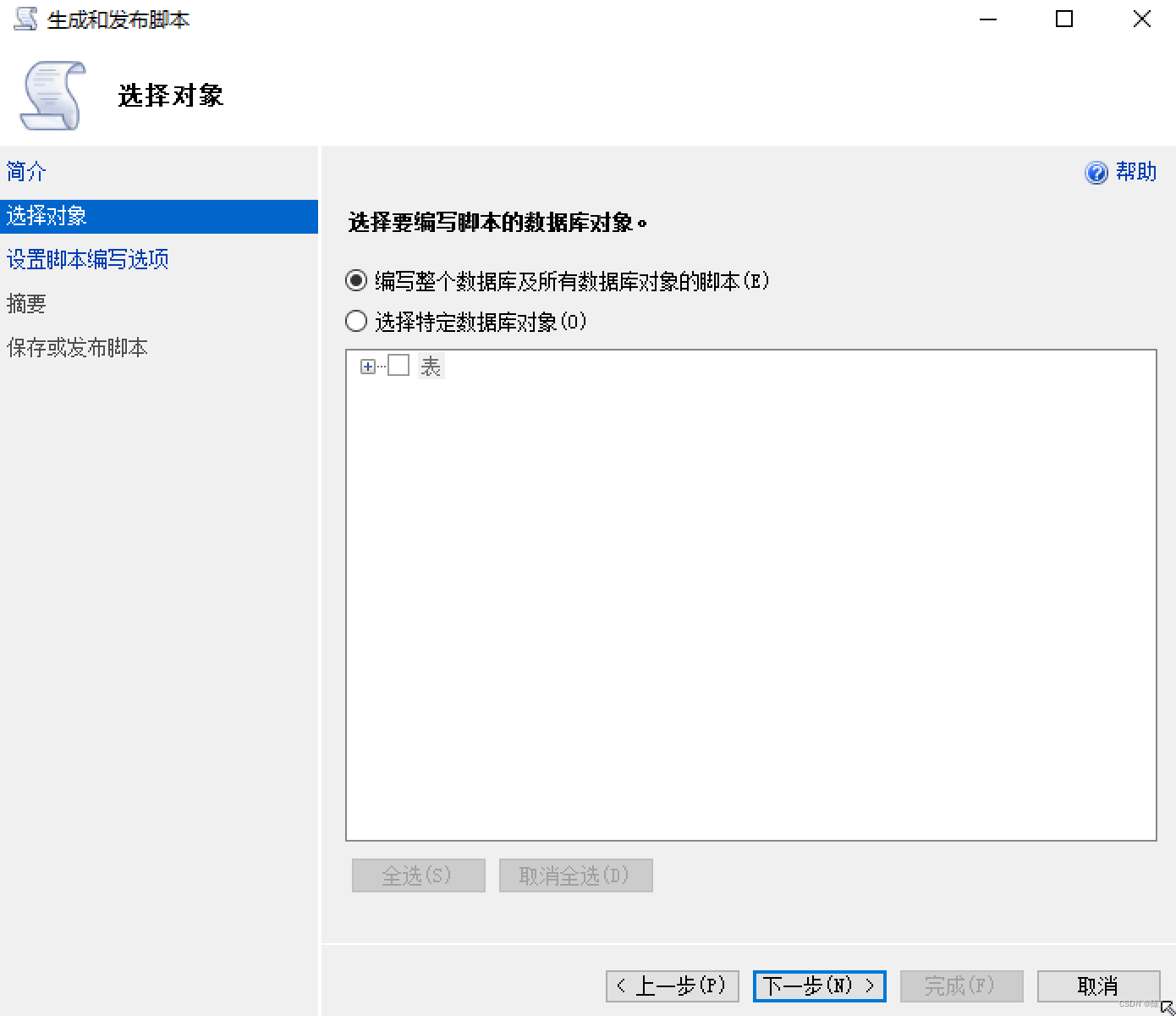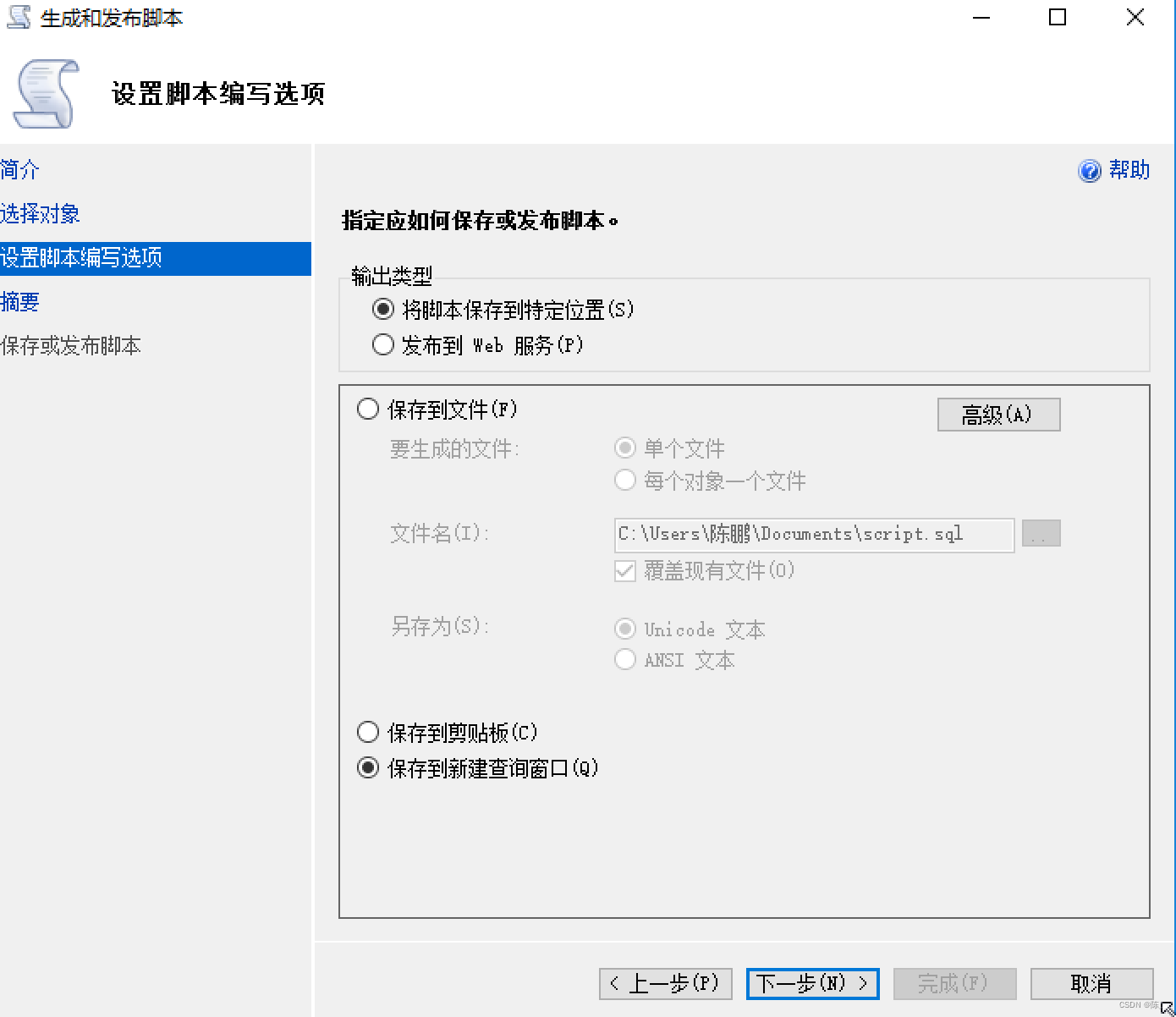 步骤1:右击数据库->任务->生成脚本->下一步->下一步(也可以根据自己的需求选择特定的表)->选择 保存到新建查询窗口(也可以根据自己的需求选择保存到文件或其它)->选择高级 ->将 要编写脚本的数据的类型 选择为 架构和数据->下一步->下一步->完成