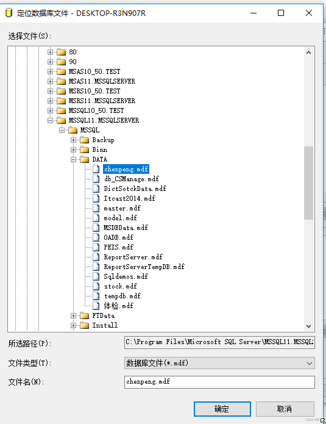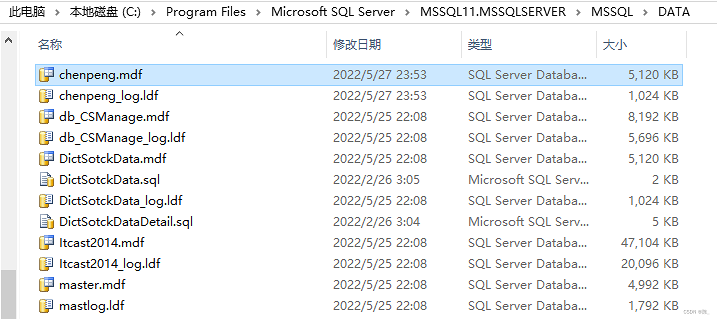 每个数据库有两个文件,一个是后缀名为mdf文件,是数据库的主数据文件,另一个是后缀名为ldf文件,是数据库的日志文件。如下图