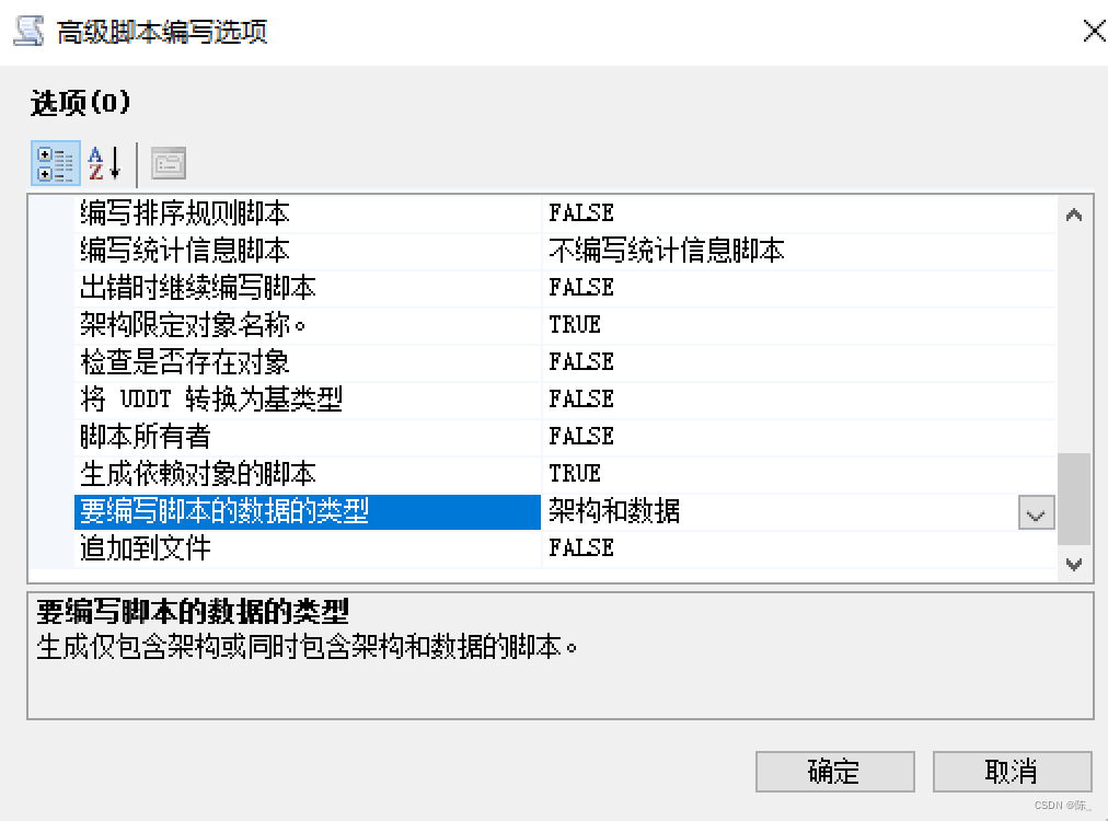 注意:一定要在高级中设置为架构和数据,否则生成的脚本中没有数据;另外高级中也可以设置sql的版本,从而将高版本的数据库的数据文件转移到低版本去。