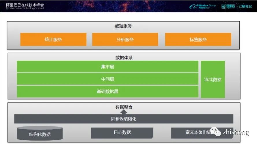在上下三层的结构的右侧,我们增加了流式数据,将其添加成数据体系的一部分。这是因为当前的数据应用方向会越来越关注数据的时效性,越实时的数据价值度越高。