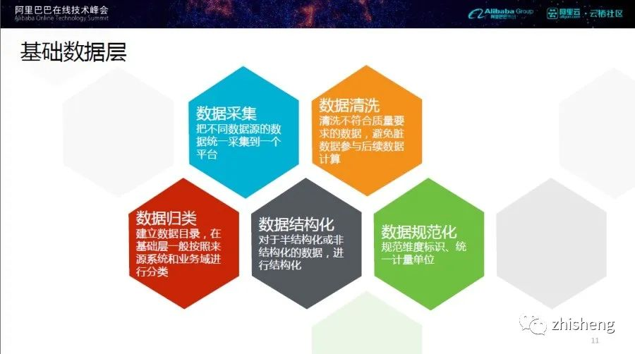 •数据采集:把不同数据源的数据统一采集到一个平台上;•数据清洗,清洗不符合质量要求的数据,避免脏数据参与后续数据计算;•数据归类,建立数据目录,在基础层一般按照来源系统和业务域进行分类;•数据结构化,对于半结构化和非结构化的数据,进行结构化;•数据规范化,包括规范维度标识、统一计量单位等规范化操作。