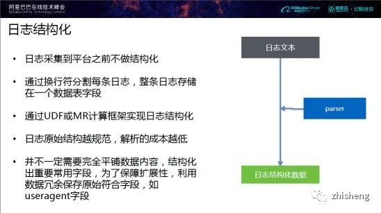 在我们看来,日志结构越规范,解析成本越低。在日志结构化的过程中,并不一定需要完全平铺数据内容,只需结构化出重要常用字段;同时,为了保障扩展性,我们可以利用数据冗余保存原始符合字段(如useragent字段)。