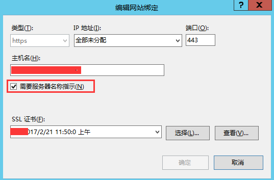 在我们常用的主机中,可能会有很多站点,我们并不能够一次性提前获知将使用此服务器的所有域名列表,但是我们不能每次修改域名重新颁发一次证书,所以有了SNI,让我们可以在一台主机上能够部署多个证书, 使得服务器可以在握手阶段选择正确虚拟域,并发送对应证书。在IIS8.0以上版本中,我们绑定域名时会有如下的选项: