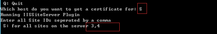 这几个选项分别对应不同的情况,这里因为我的机器下有好几个站点,我想给他们统一颁发一个证书,我选择S,之后它会提示你输入要安装的站点序号,这里我输入 3,4