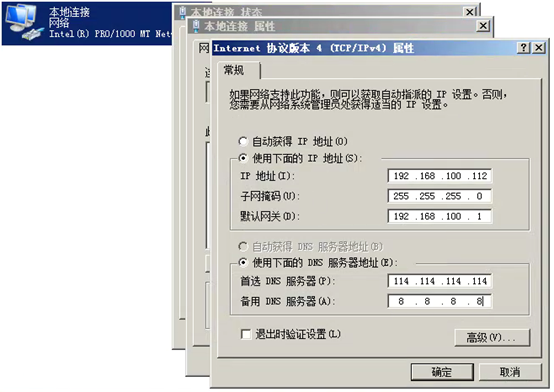 服务器一般都需要使用固定IP地址,在“本地连接”→“属性”→“TCP/IPv4属性”中调整虚拟机IP地址和DNS等配置信息。