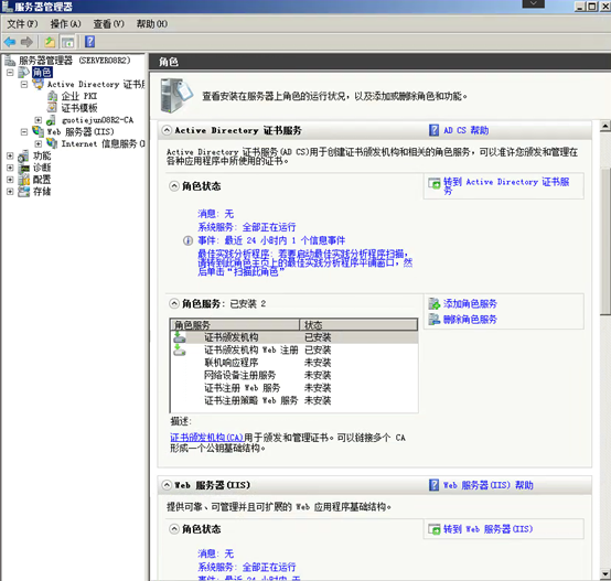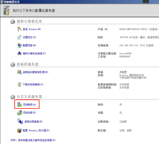 在服务器管理器页面,可以看到服务器已安装的角色信息。