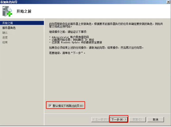添加角色向导的开始之前页面,可以勾选“默认情况下将跳过此页”,这样后续配置时就不会重复弹出了。