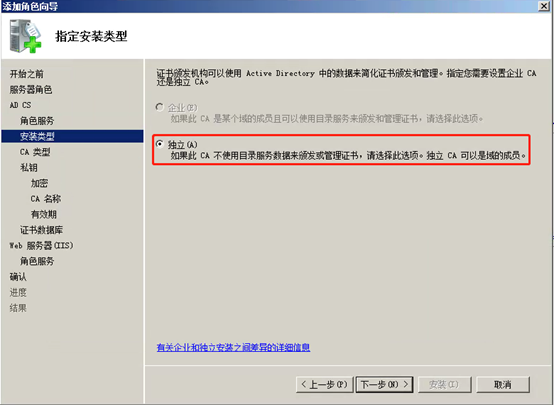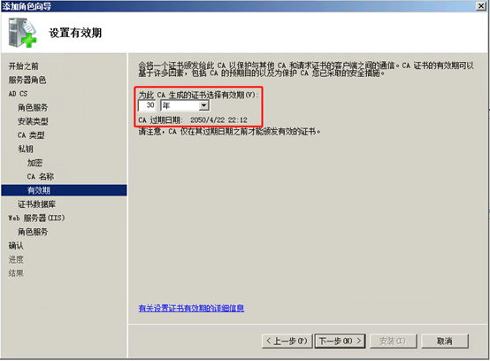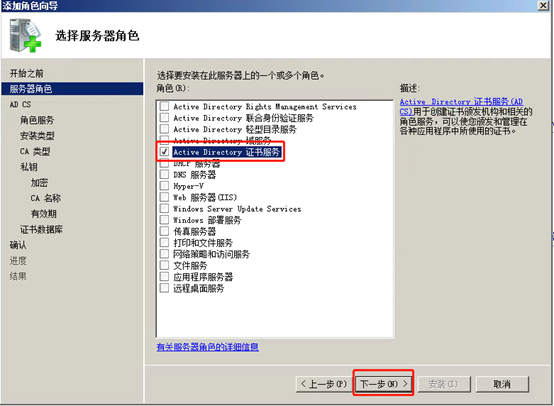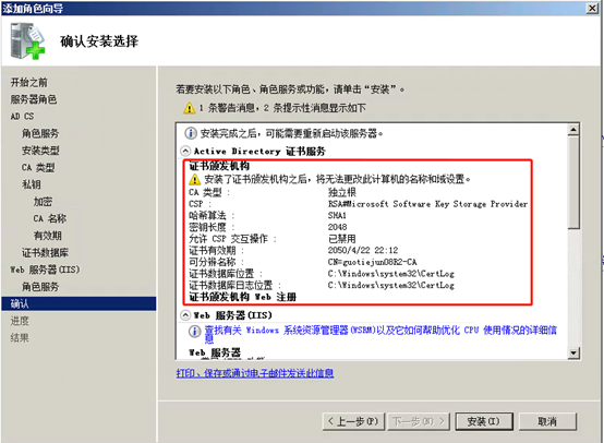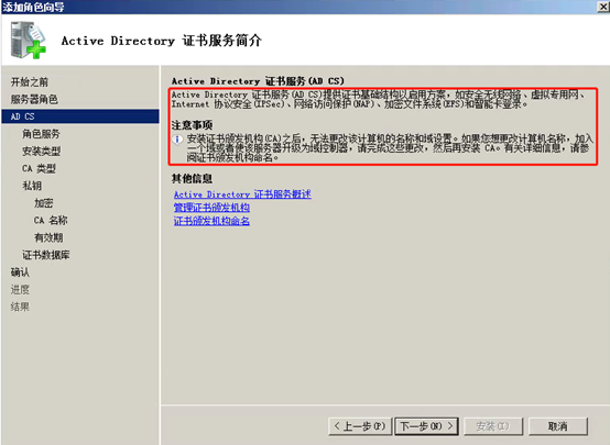 在Active Directory证书服务简介中提到,一旦安装,后续将无法更改计算机名称和域设置。因为我是临时使用,主要目的是生成证书,后面会创建新的服务器作为域控服务器,在其他场景中使用时请注意。