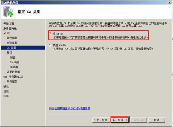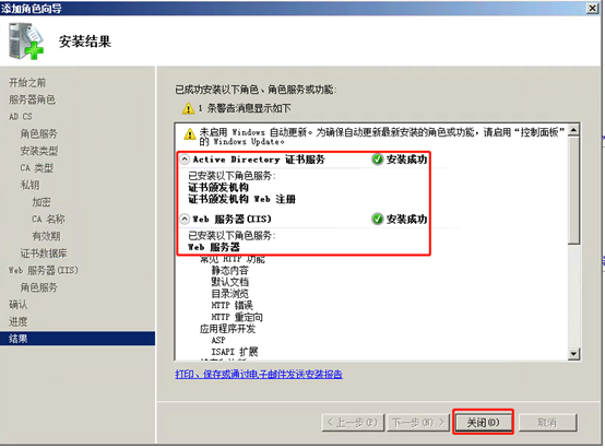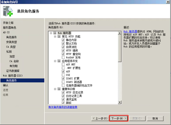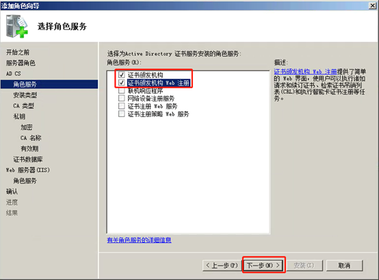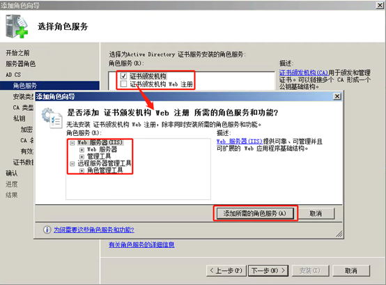 选择角色服务,勾选“证书颁发机构”和“证书颁发机构Web注册”,选择后者时会弹出提示安装“Web服务器”和“远程服务器管理工具”,点击“添加所需的角色服务”即可。