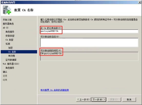 配置CA名称,默认会以服务器计算机名作为名称,可进行修改。为方便区分,我做了修改。