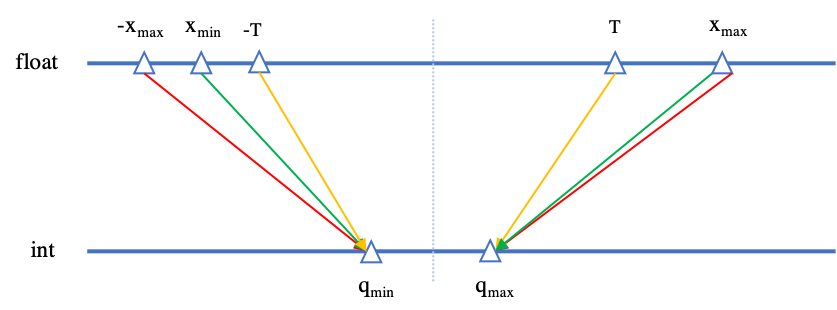 仿射方式:将浮点数的最大最小值对应映射到整数的最大最小值。