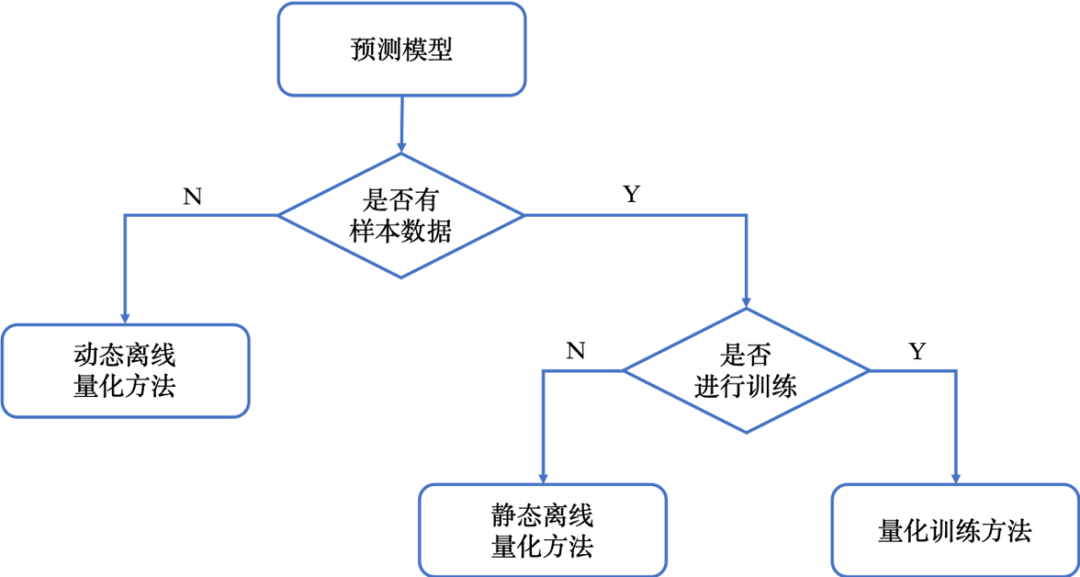 飞桨模型量化方案支持所有主流量化方法,包括动态离线量化方法、静态离线量化方法和量化训练方法。给定预测模型,飞桨模型量化可以适用于所有情况,图4说明了如何选择模型量化方法。需要注意,静态离线量化方法只需要少量无标签的样本数据,而量化训练方法需要大量有标签的样本数据。一般而言,建议大家首先使用简单、省时的静态离线量化方法。如果静态离线量化模型精度无法达到要求,再使用量化训练方法。