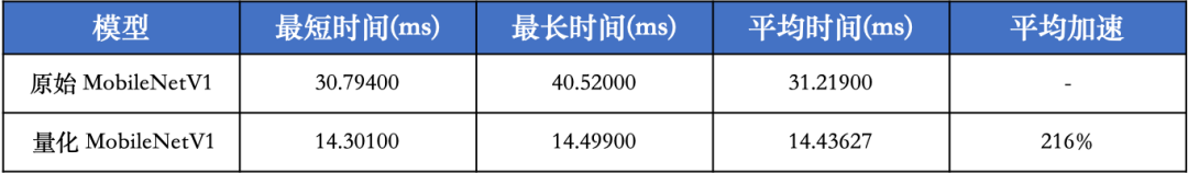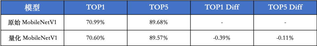 可以发现,MobileNetV1模型量化后,TOP1和TOP5精度分别只下降0.39%和0.11%。更加重要的是,如果使用量化训练方法产出量化模型,模型精度损失会更小。