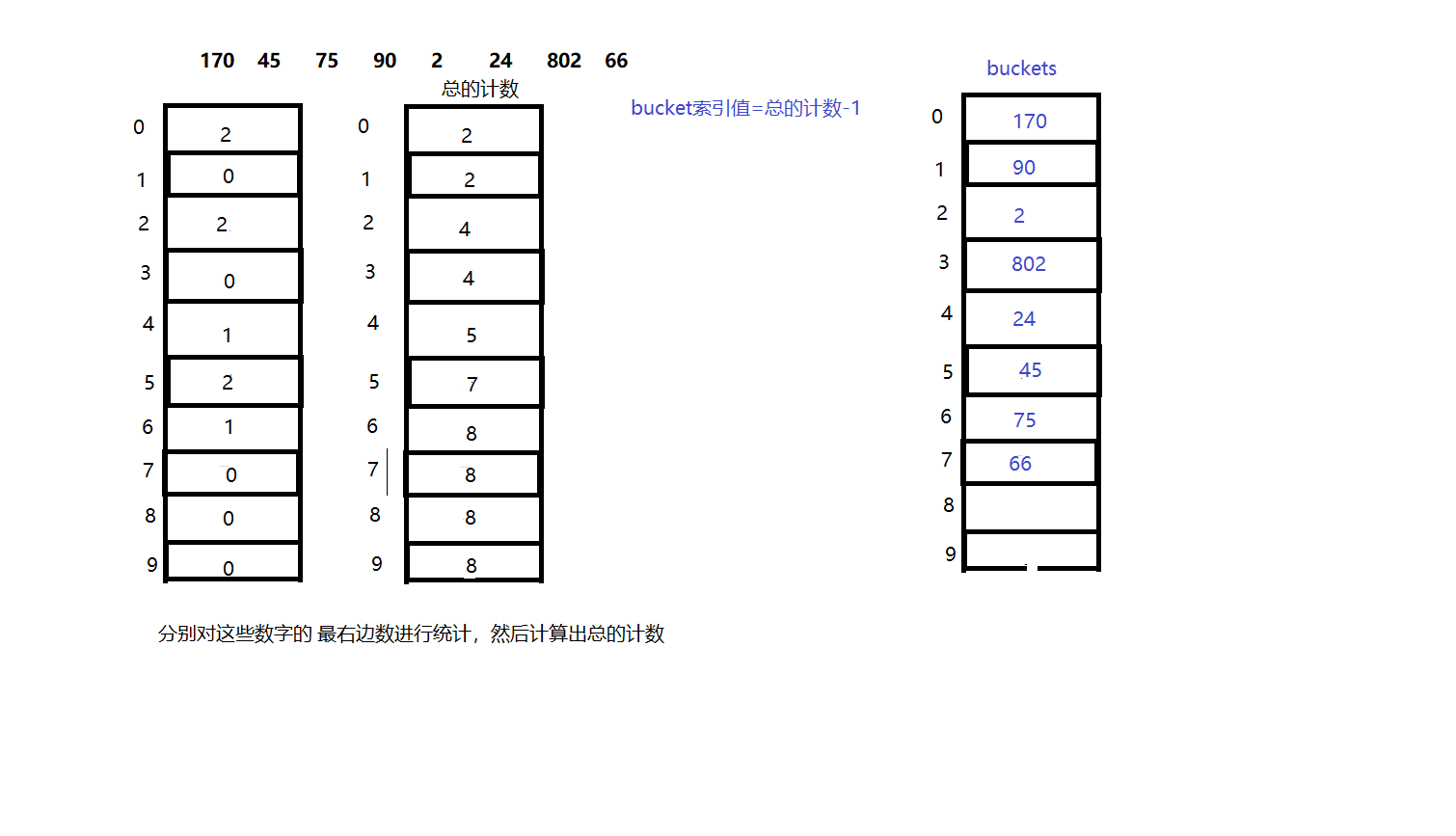 digitcount[]与bucket[]之间的联系: