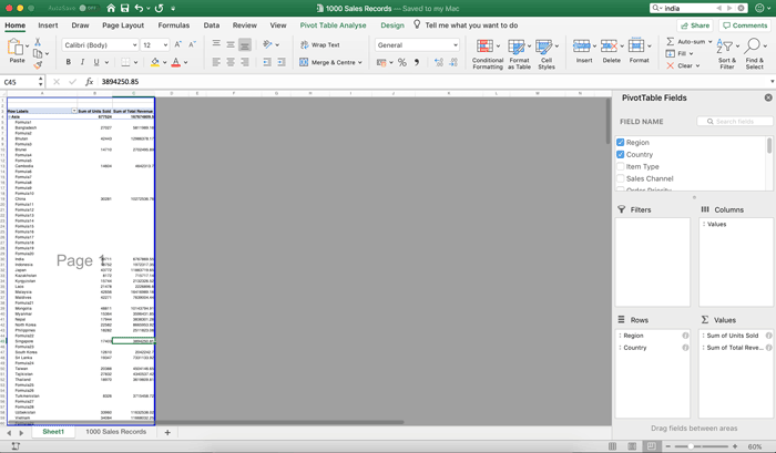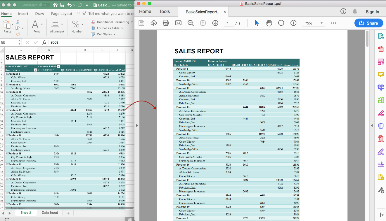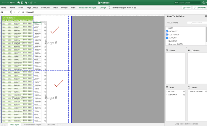 有时,我们不需要打印所有页面,只需要从 Excel 文件中打印指定的页面信息。例如以下场景,贵公司有一份年度产品和销售清单,并通过数据透视表进行分析。您可以根据需要查看特定客户的销售额和产品总销售额,但只需将数据透视表的数据分析结果打印为 PDF,以便分发给利益相关者。这时,就会用到将 Excel 电子表格的指定页面内容打印为 PDF 功能。