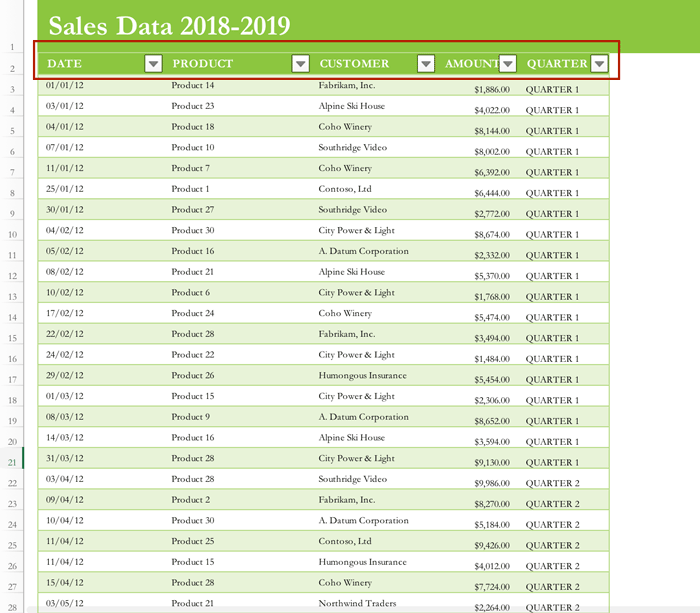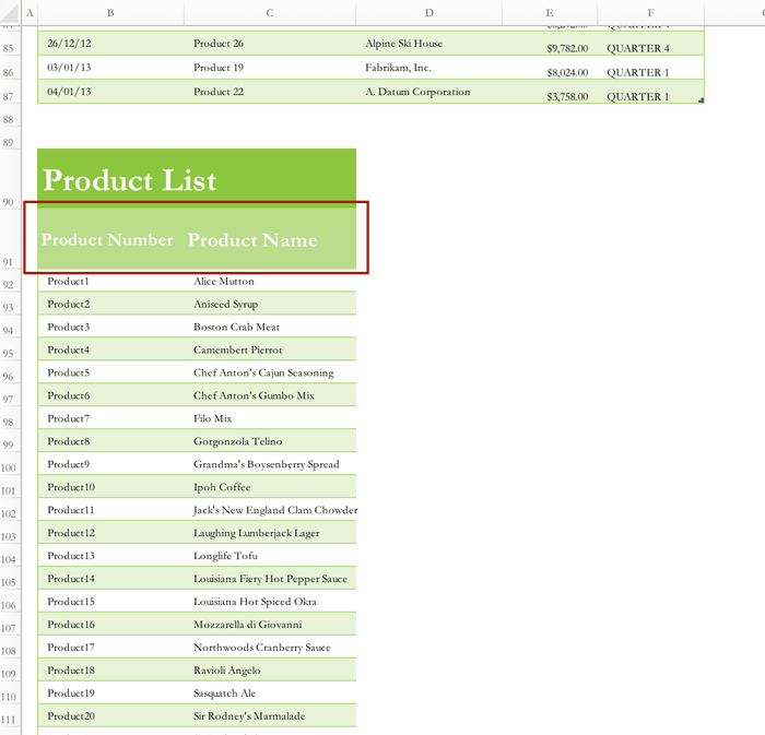 例如,在下面的销售报告中,使用了数据透视表对产品 ID 进行分组,从而显示每季度的销售数据。此表使用了不同的背景色突出显示每个行标题和子行标题内容。