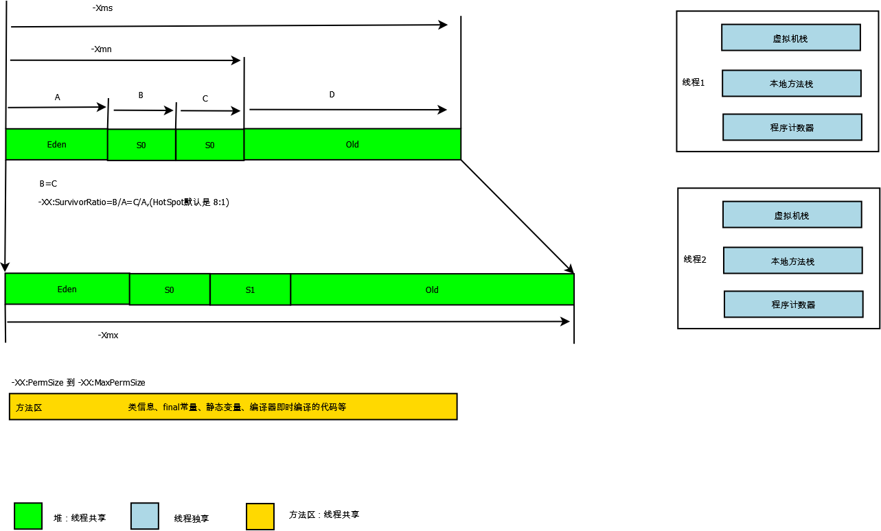 将常见的一些参数,如堆的小大小-xms和最大大小-xmx等加上有图: