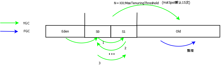 堆区主要分为Yong区和Old区,Yong区又分为Eden,S0和S1,YGC多次回收不了的对象会放入Old区。