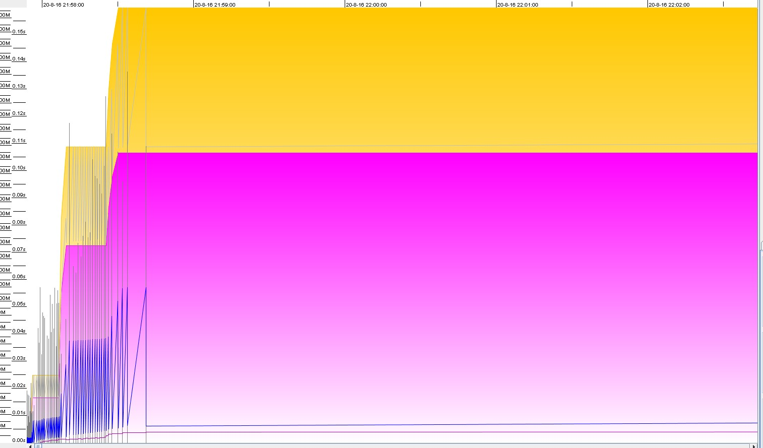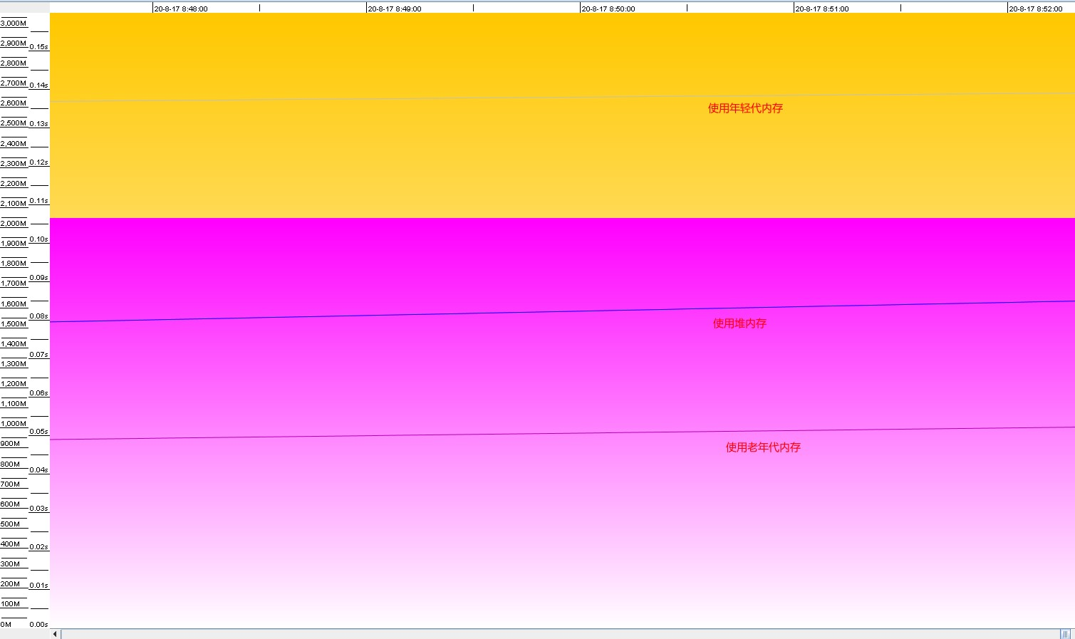 项目刚刚启动时,GC情况,jvm堆内存逐步变大,黄色代表年轻代,紫色代表老年代。