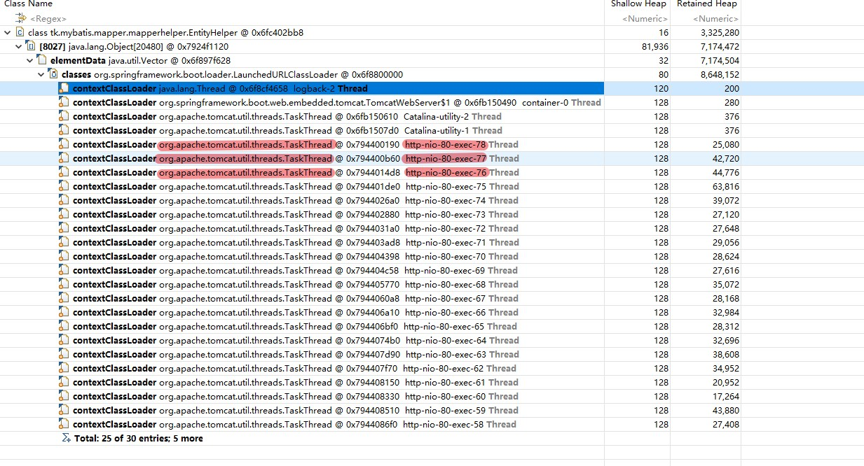 那么这里为啥会装那么多的tk.mapper对象呢,主要来源是查数据库后转换实体类而创建的,我们再看看他的GC Roots最近节点