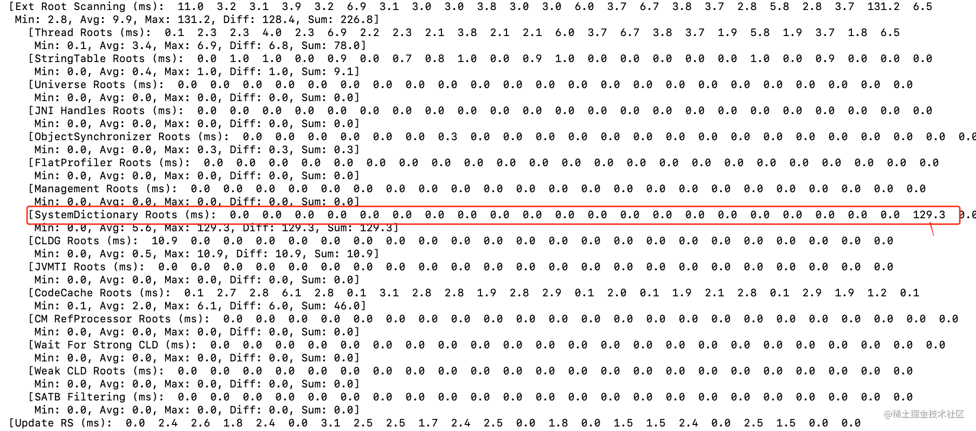 可以发现在SystemDictionary Roots阶段是比较慢的,但是这个又是啥玩意呢?在书里面是没有任何介绍的,于是又进行大量谷歌,终于是找到了一篇你假笨写的一篇文章:JVM源码分析之自定义类加载器如何拉长YGC,强烈推荐大家读完这篇文章。