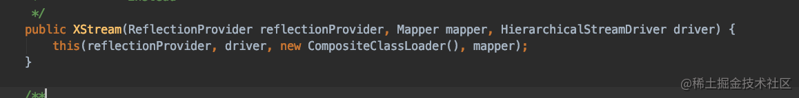 而我们的罪魁祸首其实就在这个new XStream这个方法中,我们的默认构造方法会调用下面的这个构造方法: