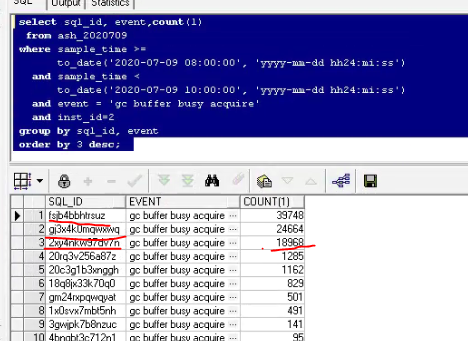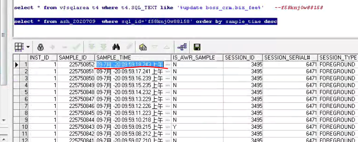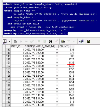 由于是业务卡顿分析,可以让客户配合出各节点实例的awr报告辅助分析,另一方面同时进行分析ASH信息:
