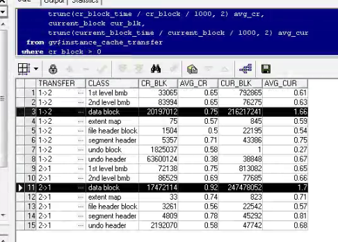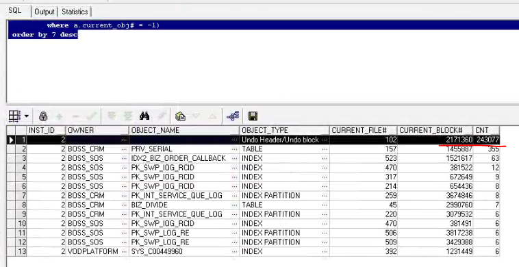 可以看到Undo Header/Undo block的统计次数最大,最严重的GC等待来自undo上的数据块,验证了前面cr块的gc传输很大的情况。由于都是同一个表的gc传输,这时客户开发反馈,昨晚有业务处理