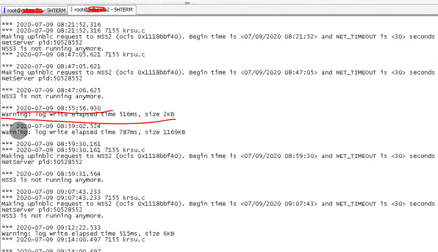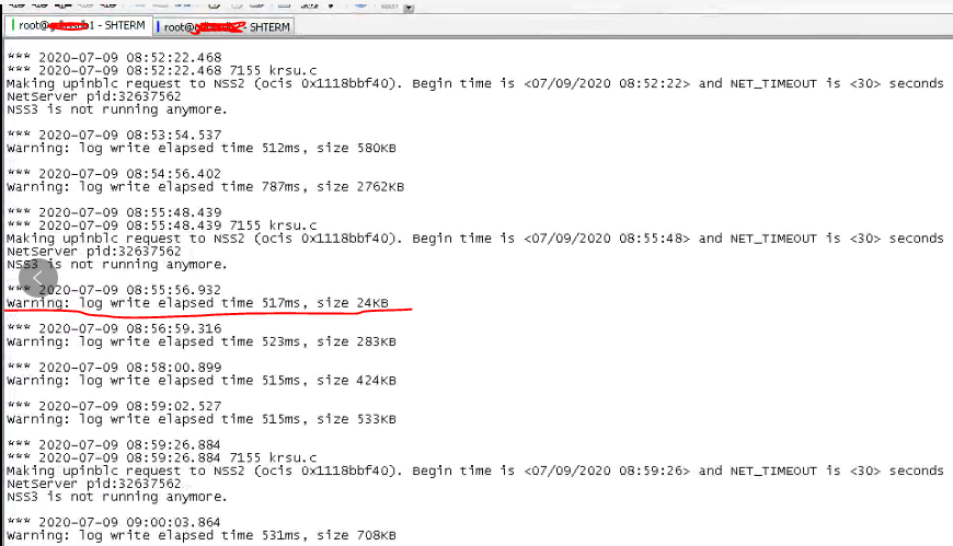 节点1、节点2,也就是实例1、实例2的lgwr写入都存在写入延迟的问题,lgwr写入抖动很严重,2KB都要写516ms,lgwr写入慢,如果碰上大量的gc块获取,就会产生大量的gc等待,这里lgwr刷新需求和lgwr写入慢相应验证插入业务卡顿的故障现象。