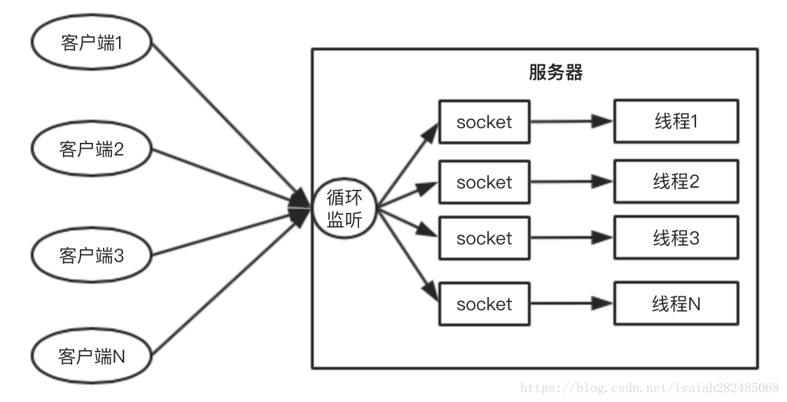 服务器端监听服务端的到来,当监听到客户端到来之后,将创建一个线程去处理客户端Socket