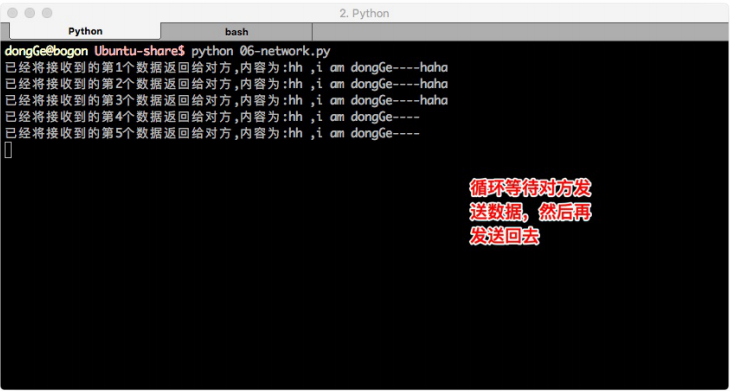 print('已经将接收到的第%d个数据返回给对方,内容为:%s'%(num,recvData))