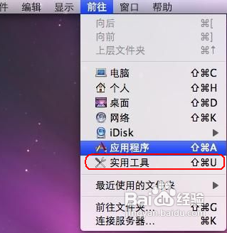 2、在Finder栏中,点击“前往(GO)”,选择“实用工具”,再双击打开“终端”: